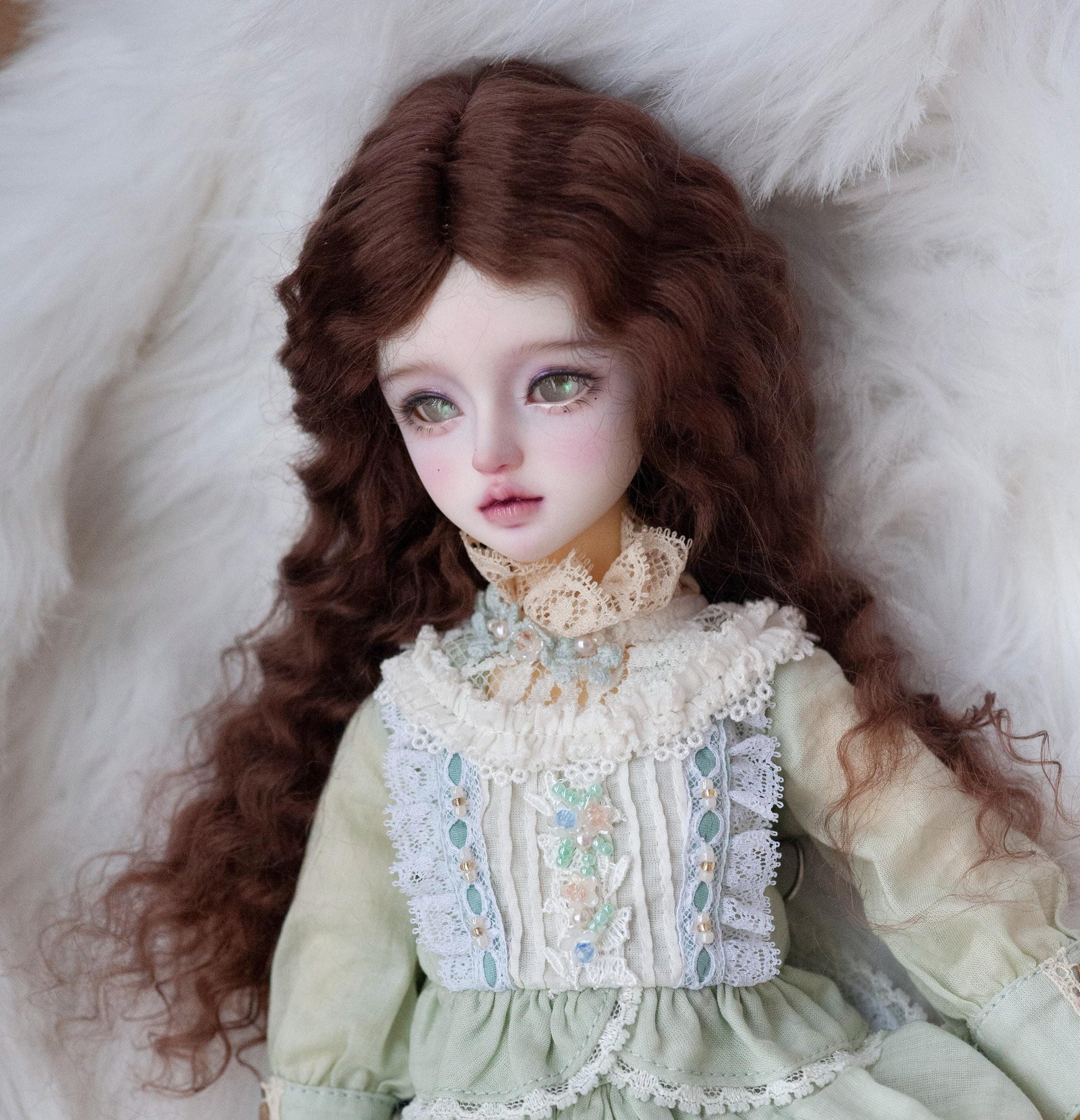 100% handmade long curly wig for dolls, size from 5.5" to 9.5". Made of soft angora mohair and fabric hard wig cap, very soft and feels comfortable. Can be styled under 180 Celsius (356 Fahrenheit).